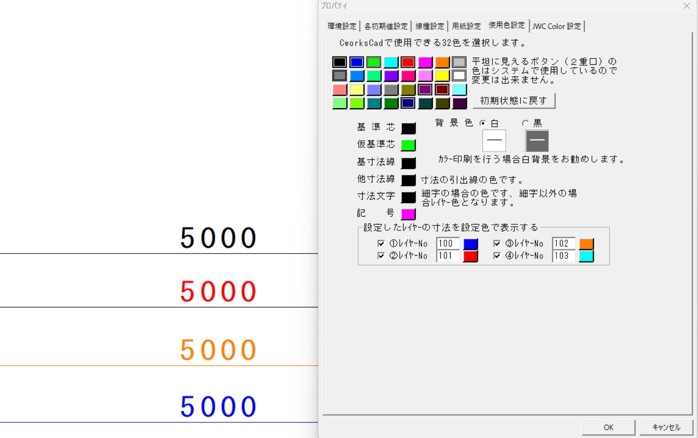 ファイル→プロパティの仕様色設定にて、規定の寸法の色以外に、4色レイヤーで設定することができるようになりました。
